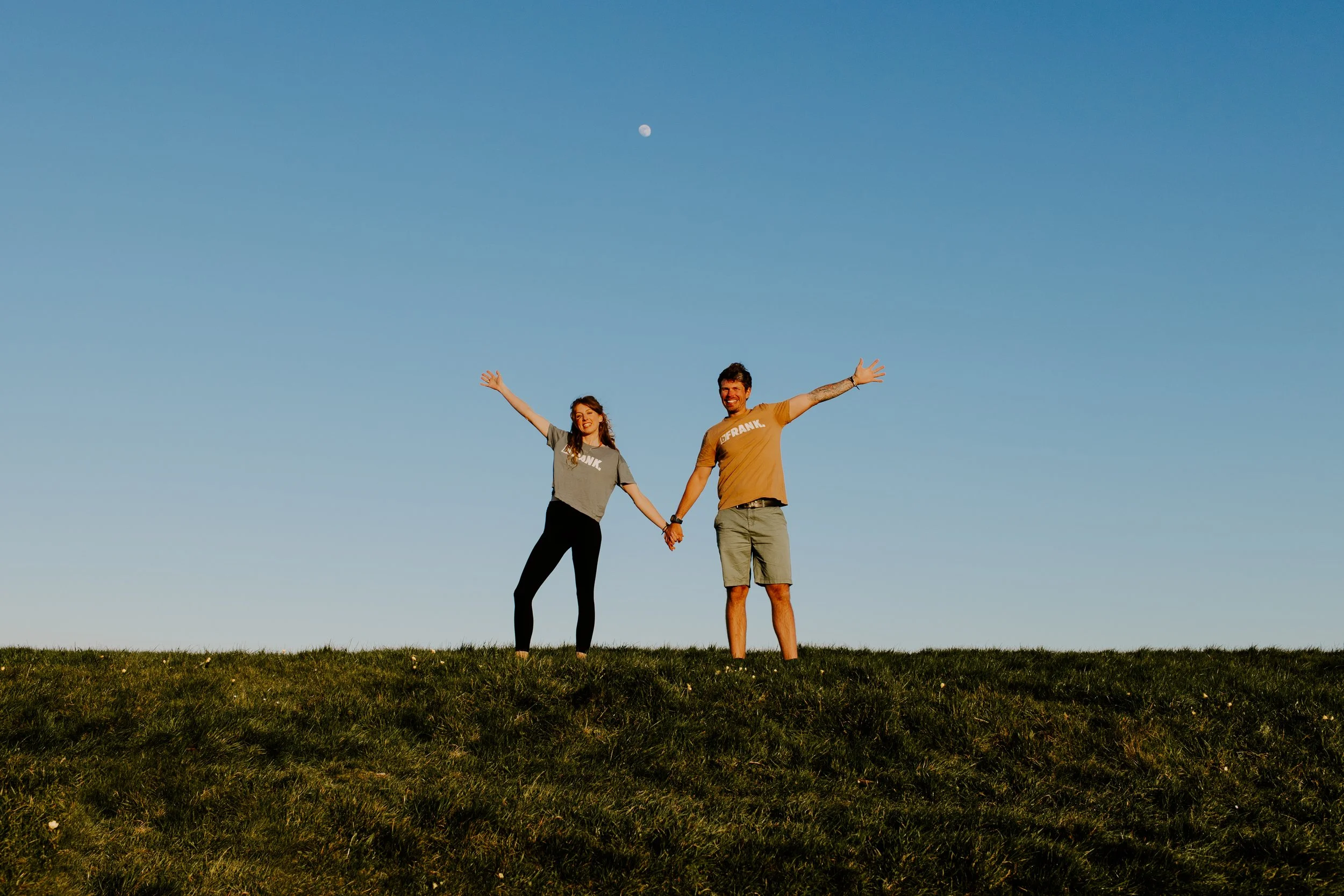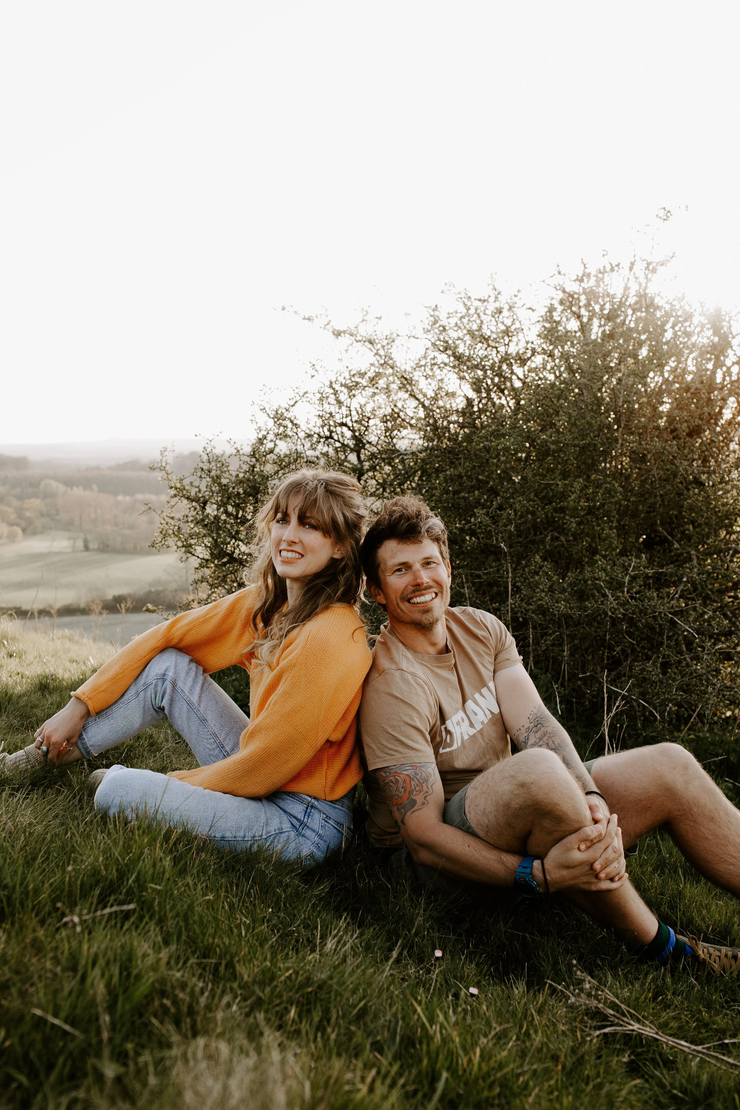 A smiling young man and woman sit on a grassy hill near bushes, with rolling hills in the background, during late afternoon or early evening.